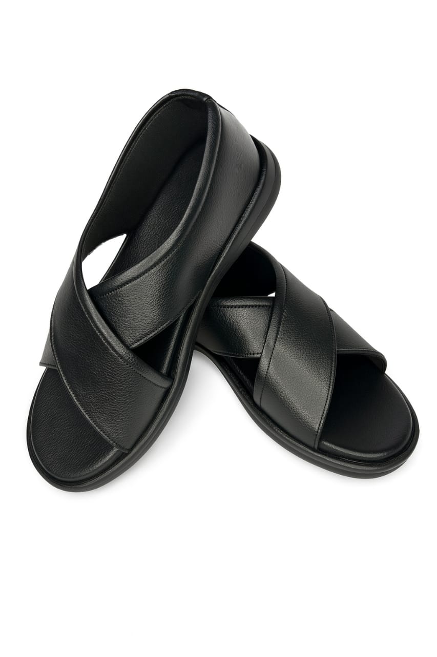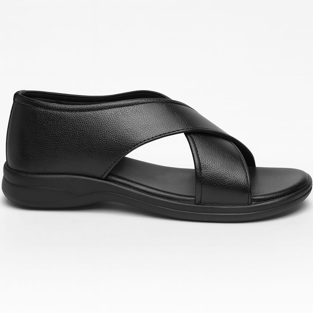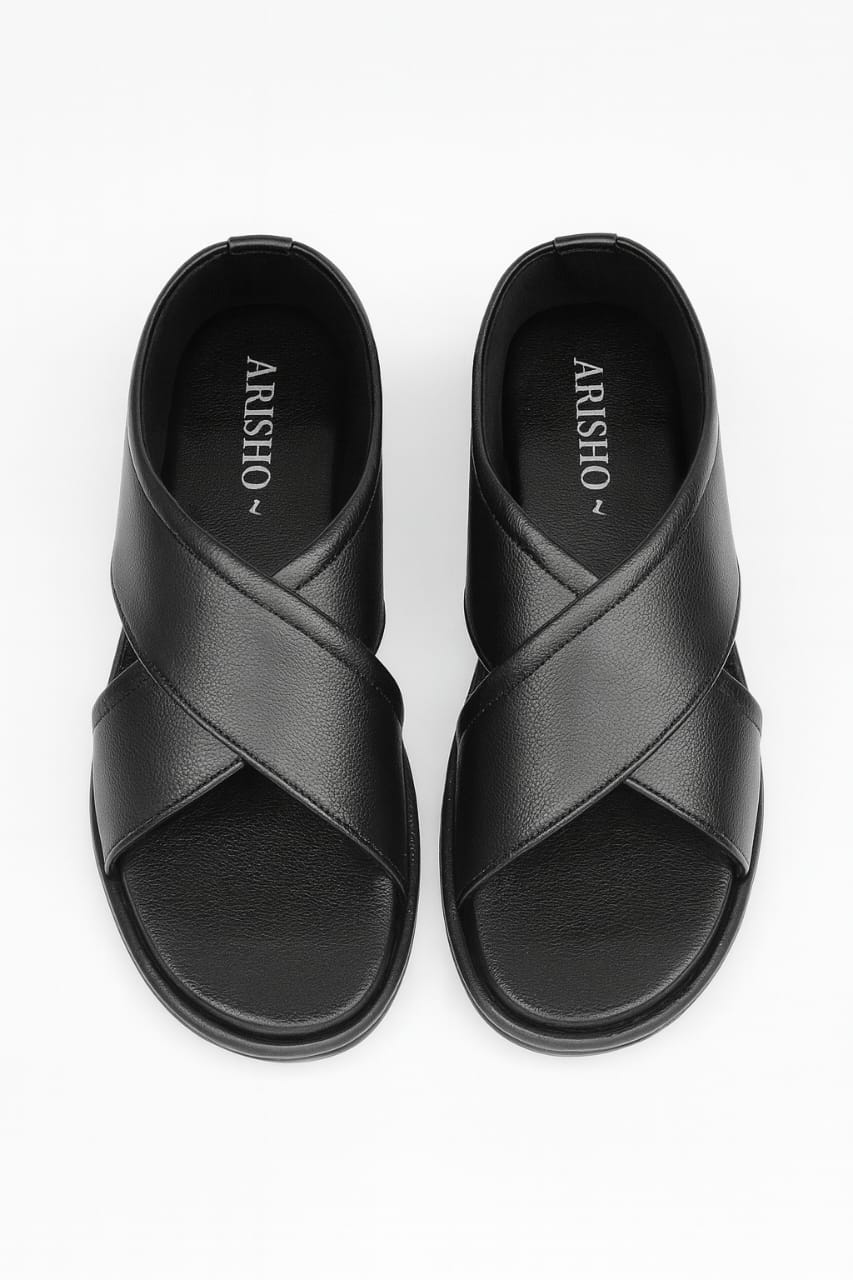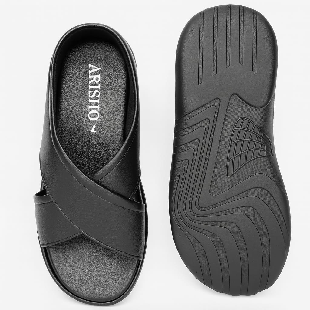 Step into ultimate comfort with these sophisticated black cross-strap sandals from Arisho. Crafted from premium faux leather, these slip-on slides feature an innovative cross-strap design that provides excellent foot support while maintaining a sleek, minimalist aesthetic. The ergonomically designed cushioned sole ensures comfortable walking experience throughout the day. These versatile sandals combine style with functionality, making them perfect for casual outings, weekend strolls, or everyday wear. The durable construction and quality materials ensure long-lasting wear, while the streamlined silhouette adds a touch of contemporary elegance. The thoughtfully designed straps offer secure fitting, and the cushioned footbed adapts to your stride for enhanced comfort. These sandals are ideal for those seeking a perfect balance of style, comfort, and practicality in their footwear. The black colour ensures these sandals complement virtually any casual ensemble, making them a versatile addition to your wardrobe.