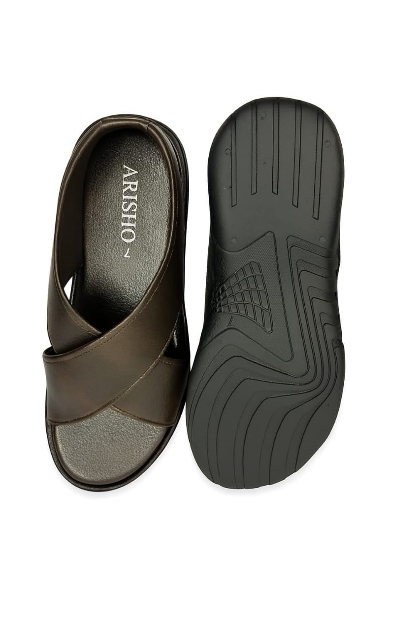 Step into ultimate comfort with these sophisticated brown cross-strap sandals from Arisho. Crafted from premium faux leather, these slip-on slides feature an innovative cross-strap design that provides excellent foot support while maintaining a sleek, minimalist aesthetic. The ergonomically designed cushioned sole ensures comfortable walking experience throughout the day. These versatile sandals combine style with functionality, making them perfect for casual outings, weekend strolls, or everyday wear. The durable construction and quality materials ensure long-lasting wear, while the streamlined silhouette adds a touch of contemporary elegance. The thoughtfully designed straps offer secure fitting, and the cushioned footbed adapts to your stride for enhanced comfort. These sandals are ideal for those seeking a perfect balance of style, comfort, and practicality in their footwear. The black color ensures these sandals complement virtually any casual ensemble, making them a versatile addition to your wardrobe.