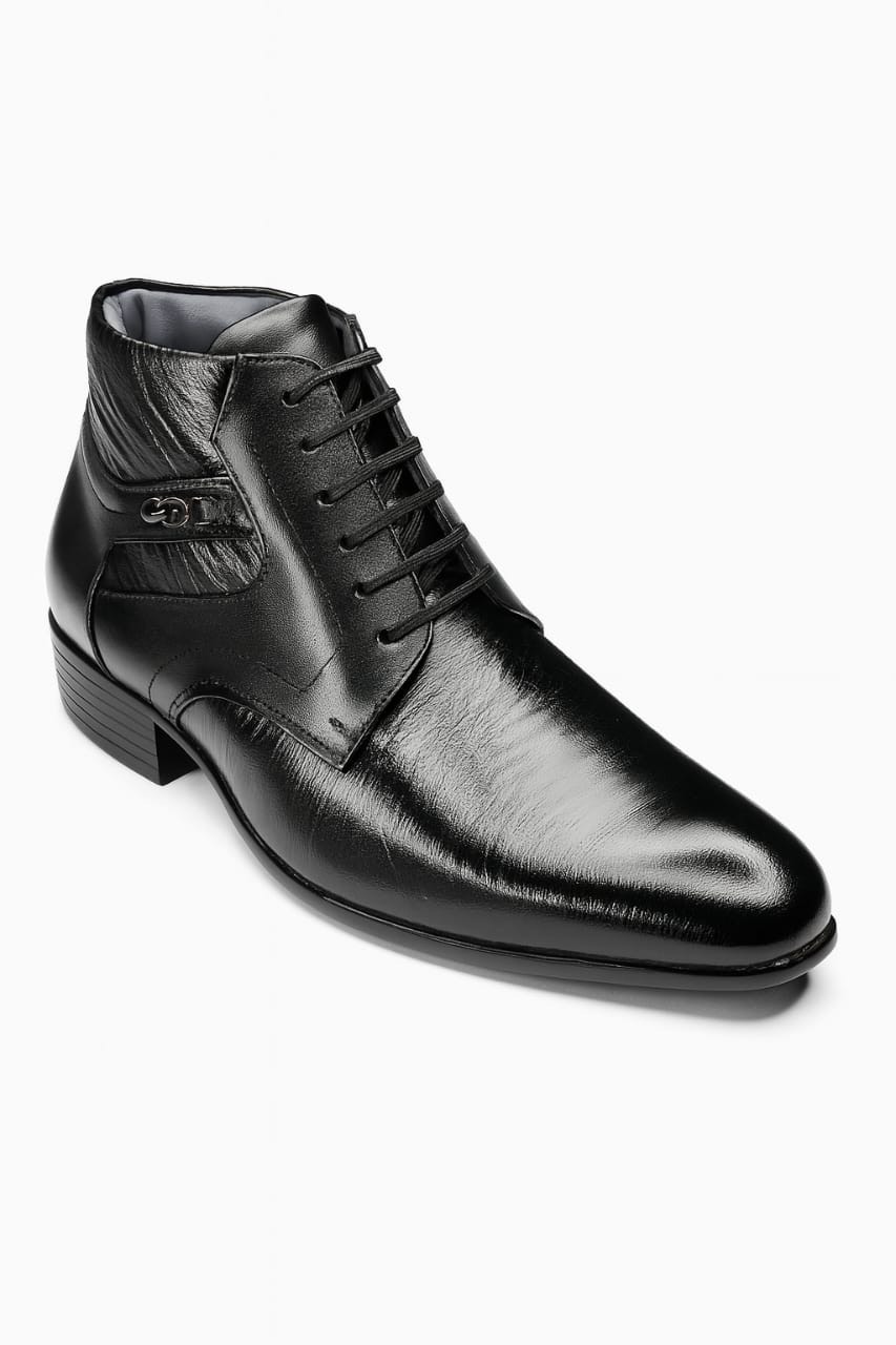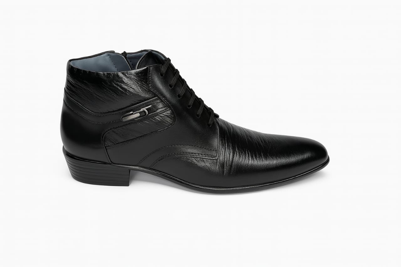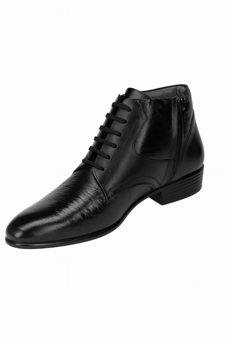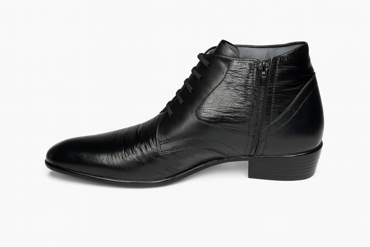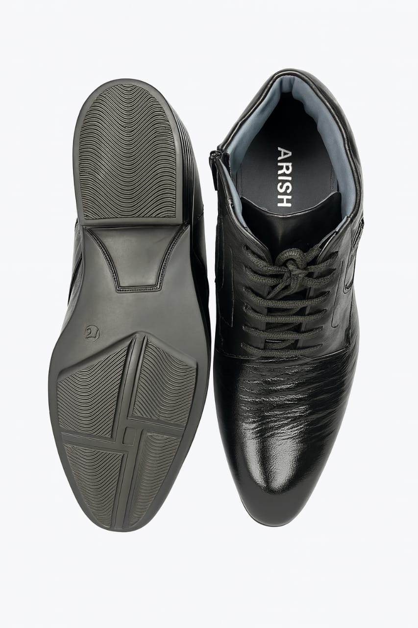 Elevate your formal wardrobe with the Arisho Executive Zip Ankle Boot. Expertly crafted from smooth, high-quality leather, this ankle boot blends timeless Derby lines with a discreet side zipper for quick on-and-off wear. The sleek, tapered toe and subtle stitching create a refined silhouette that shines at the office and at evening events. Inside, a cushioned footbed supports long days while the non-slip, durable outsole provides dependable traction. Finished in deep black with polished accents, this boot is an effortless match for suits, dress trousers, and smart-casual looks — a versatile staple for the modern gentleman.