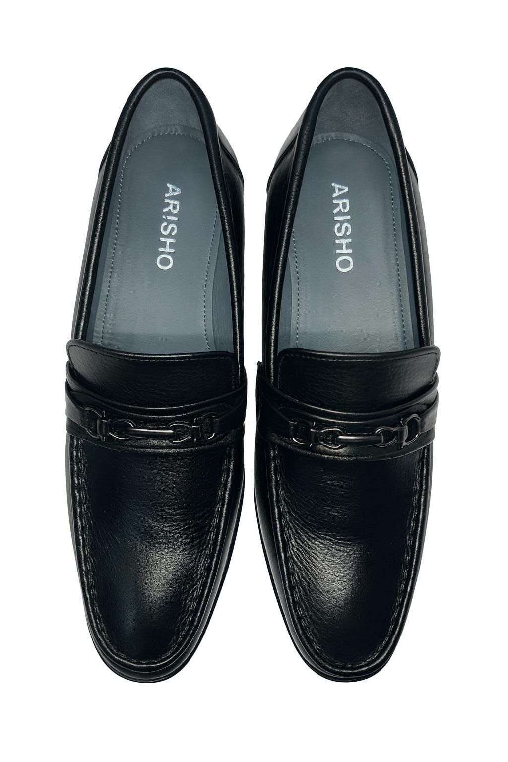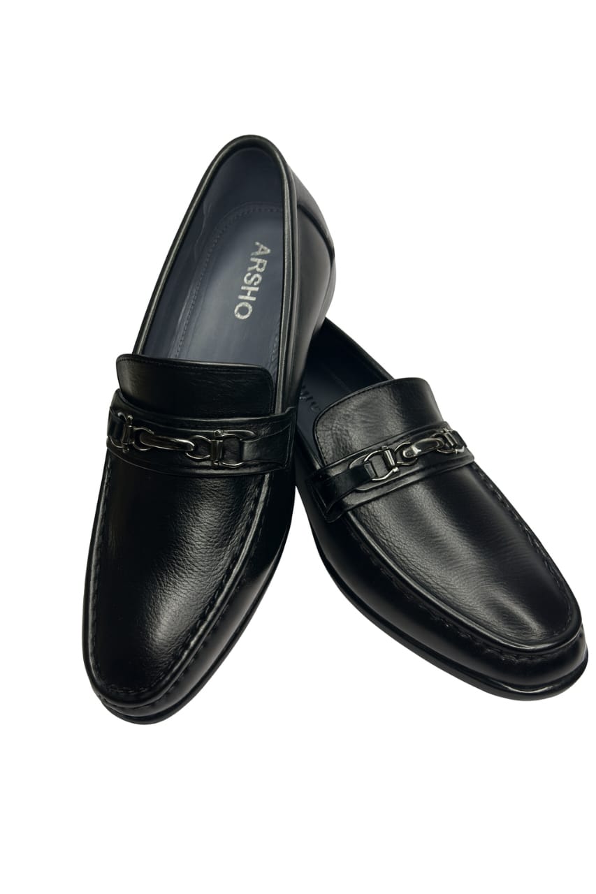 Add effortless elegance to your look with these Genuine Leather Black Slip-On Loafers for Men from Arisho. Crafted from premium leather with a sleek metal bit detail, they offer a perfect balance of class and comfort. The soft cushioned insole and durable outsole ensure all-day support, while the slip-on design makes them easy to wear. Ideal for office, parties, or casual outings — these loafers redefine timeless style and versatility.